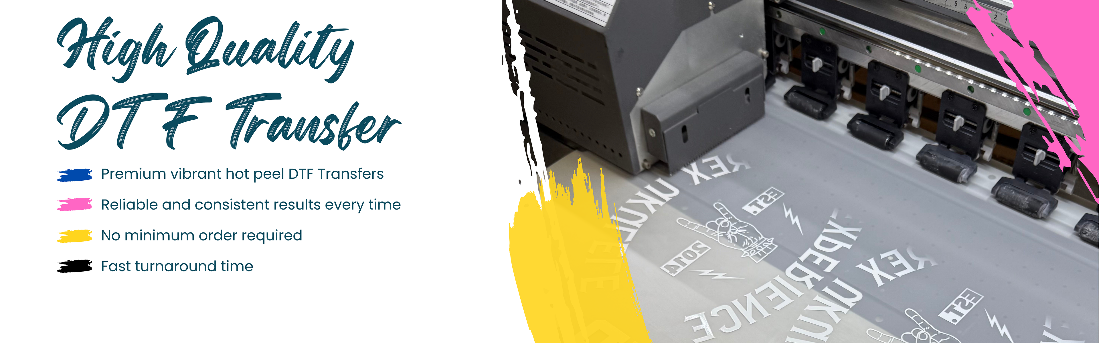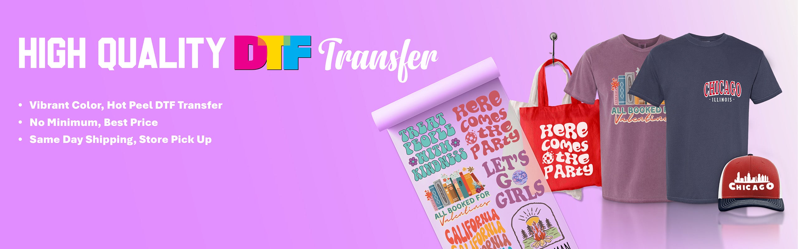 Prepare your designs for printing on your products, whether simple or vibrant and colorful. If you have a single design, please upload it through the 'Transfer by Size' section. For multiple designs, use the 'DTF Gang Roll' section for submission. Whether your design is vibrant, colorful, minimalistic, or intricately detailed, you can upload any creation you envision. Alternatively, explore our extensive design collection, and we will expertly transform it into a high-quality direct-to-film transfer.